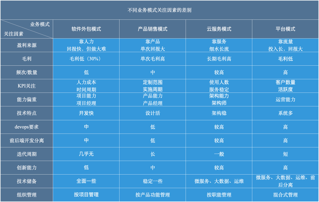 用于举例说明,我简单的把业务模式抽象成:软件外包模式,产品销售模式,云服务模式和平台模式。前两种偏传统软件业务,后两种偏互联网业务,它们肯定会存在若干的差异(如上图表格,仅做示例,不全面)。