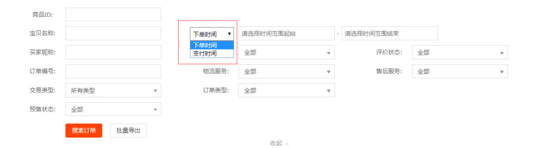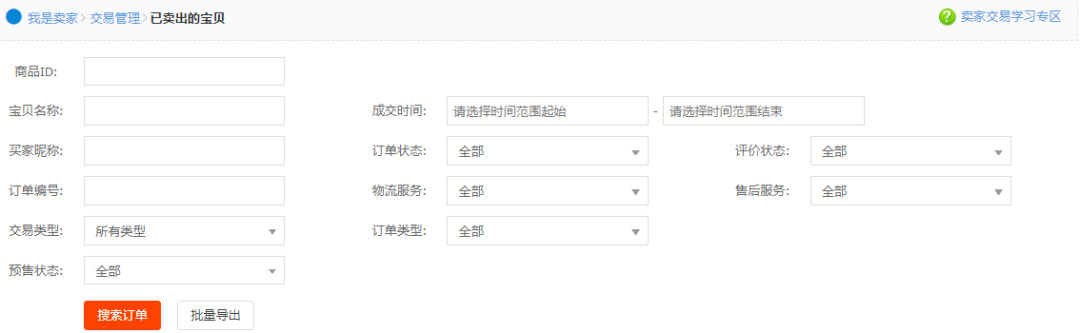 当前列表所在的表单可能包括的字段有很多,不是每一个字段项都需要拿来作筛选条件,评估能作为筛选条件的标准即为:符合用户真实需求场景,就是说用户真实场景下会使用这些条件去搜寻自己想要的数据,用户在当前列表用不到的可以不作为筛选条件,天猫商家后台“已卖出的宝贝”筛选条件中并没有价格区间,商家筛选价格区间应该是在客户运营的时候,而不是在订单列表,所以此处无需提供价格区间筛选条件。