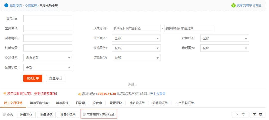 一般会提供几个常用的快捷选项方便用户直接筛选出想要的结果/过滤不想要的结果,如“天猫>已卖出的宝贝”提供过滤已关闭订单的快捷选项。