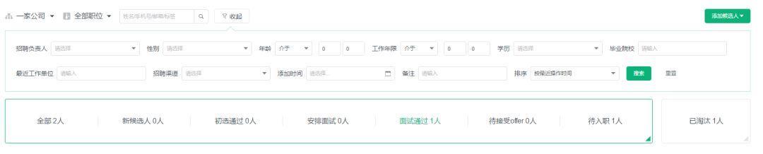 需要看到查询的结果在各tab下的分布情况时,tab在下,如2号人事>候选人筛选。