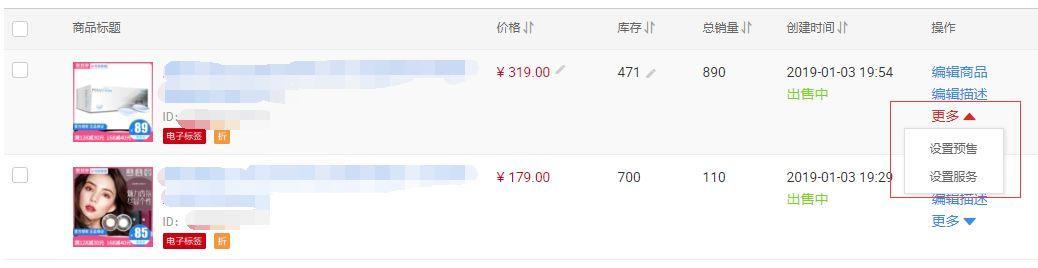 与某列相关的操作可直接放置在该列中,目标清晰,节省操作列的位置,也方便用户操作,不用到最后一列找操作项,如上下架,添加备注。