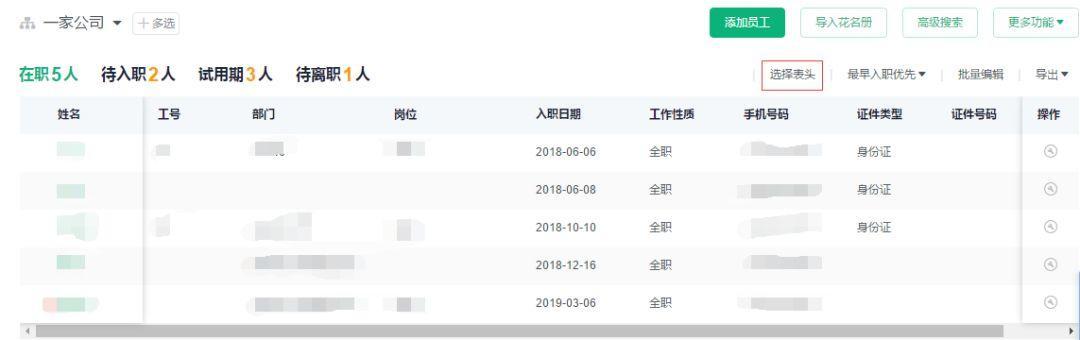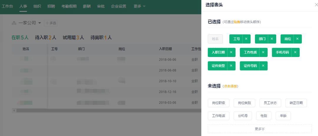 - 提供自定义表头功能(仅限用户可能需要的字段很多的情况),默认展示用户关注度最高的字段内容,如2号人事>花名册;