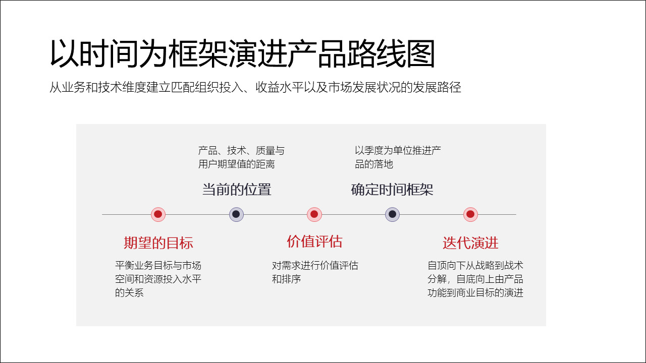 产品路径图的时间框架,我的建议是以季度为单位,不同的产品要具体分析,但没必须做成里程碑,制定某月某日的规划是没有意义的。