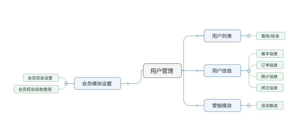 在理解自身的业务之后,我们可以从运营同学那里了解一下用户管理的基本需求。包含用户列表查询,用户信息查询,营销模块,会员模块设置等功能。如下图:
