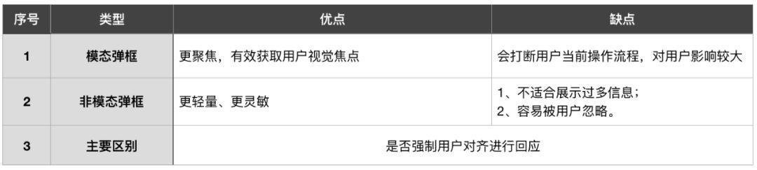 模态弹框:弹出时父级视图的操作被中断,用户需要首先解决弹框中的任务或者取消返回,才能去做其他事情。