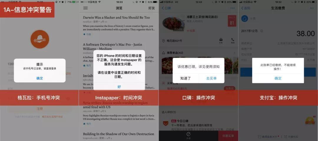 - 信息冲突警告:信息内容有重复或冲突。比如,手机重复注册、时间不一致、重复领取优惠券、重复缴纳账单等冲突类型。