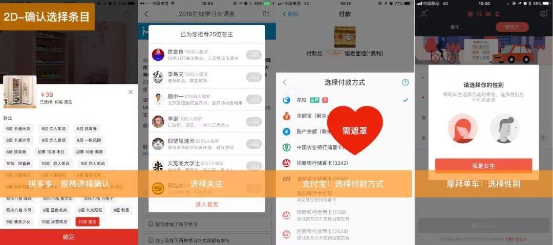 - 确认选择条目:保证用户的选择权。如选择男女性别,支付方式等。