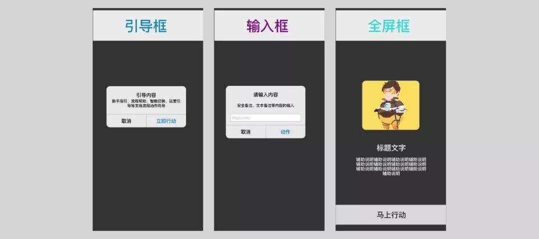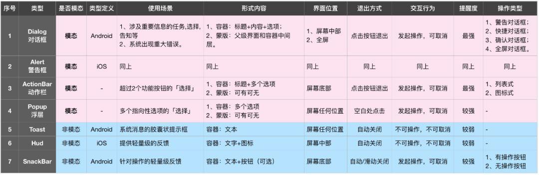 整个家族成员的关系和定位见下图,每一种弹框的形式位置都不同,它们对用户的干扰也不同。