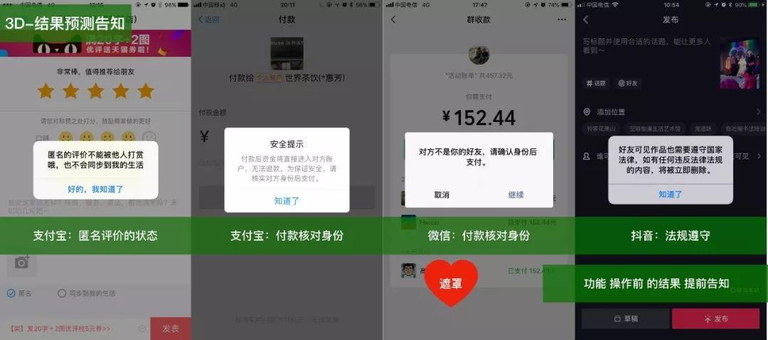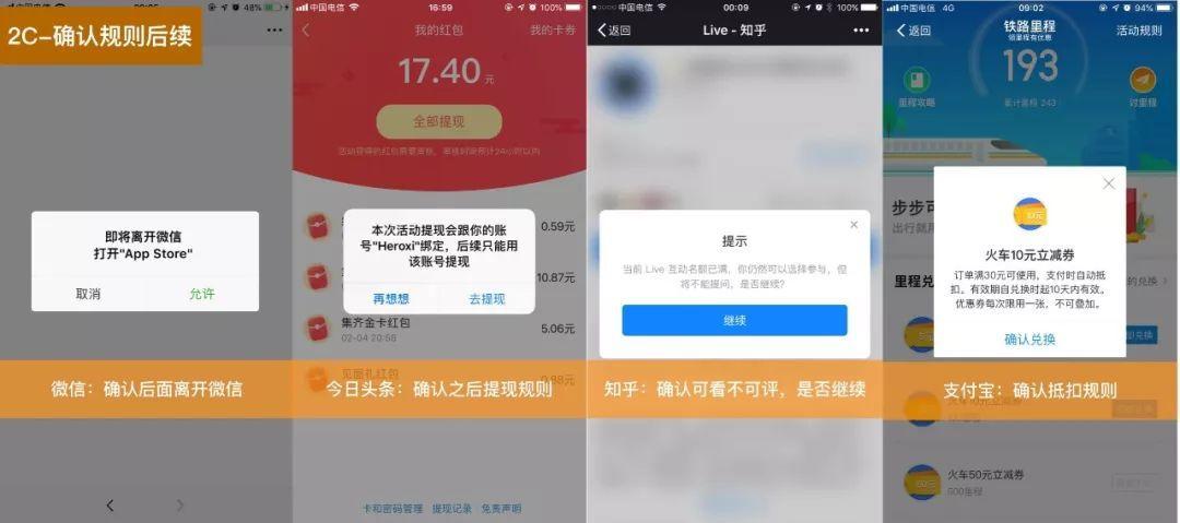 - 确认规则后续:保证用户的知情权。如进入直播后只能观看不能评论,是否继续;即将前往第三方;后续无法修改,不可取消,是否往下。PS:跟「功能告知」的区别:这个是动态的、流程的,并且有进一步操作。如,规则满30元才能使用,是否继续往下。