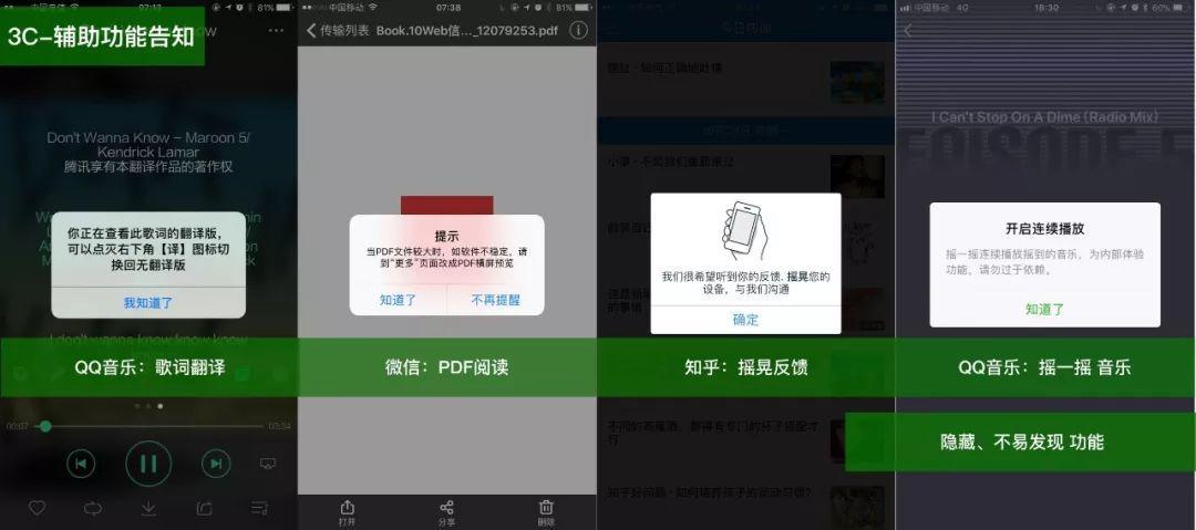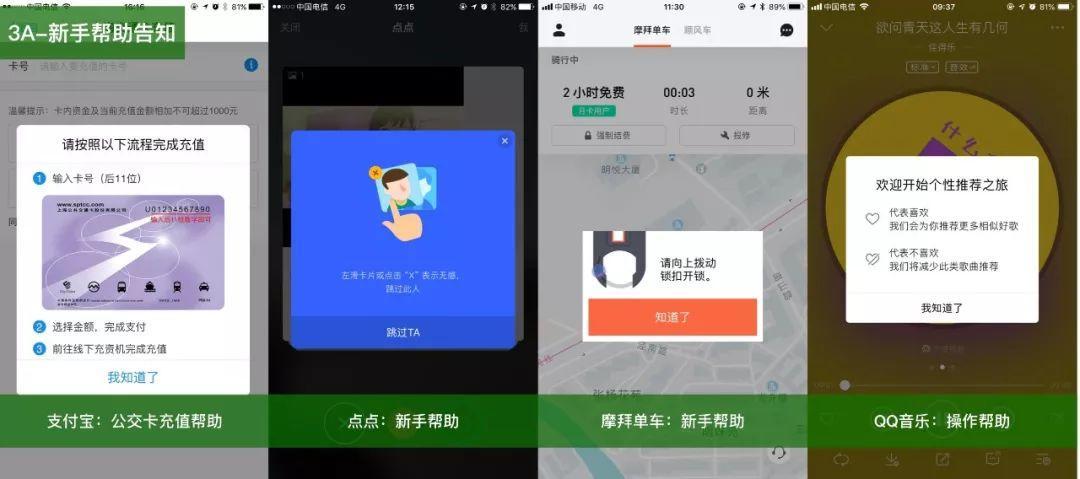 - 辅助功能告知:隐藏的、不易发现、趣味性的、不是很重要功能适时告知,增加趣味性。