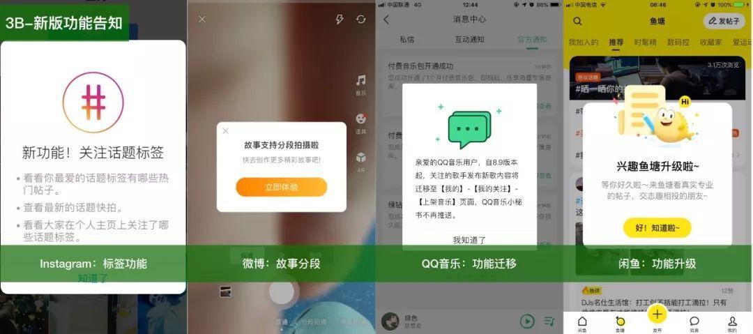 - 新版功能告知:对于新版发布的功能进行告知,如个别功能的调整,如何使用等。
