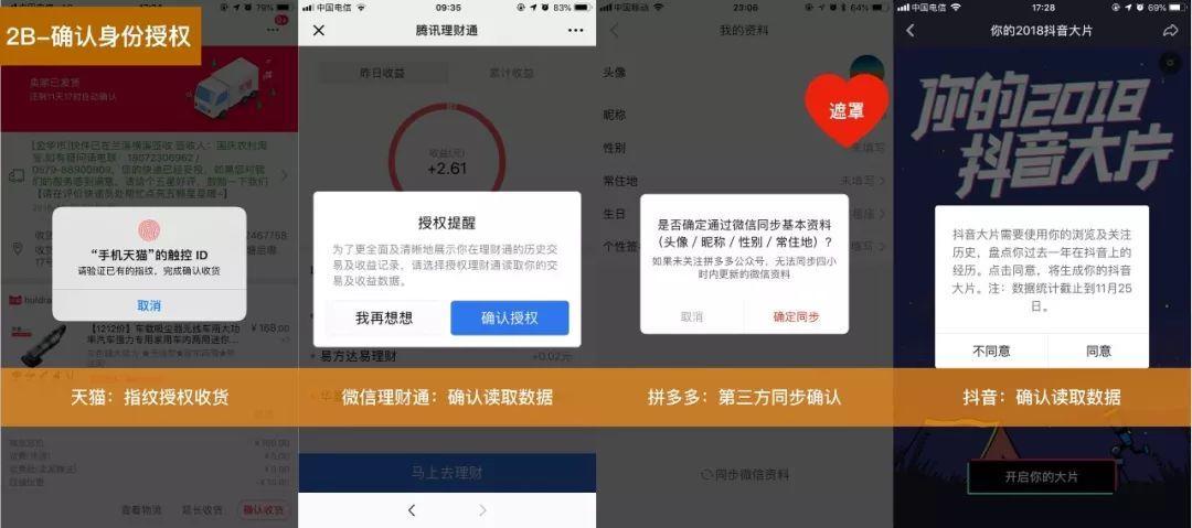 - 确认身份授权:保证信息的合法性。如进行指纹验证,三方授权。