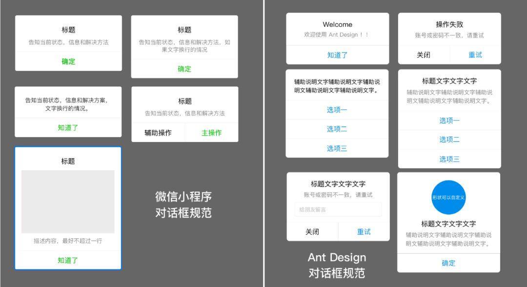 比如,以下分别是微信小程序和Ant Design中定义的对话框规范。