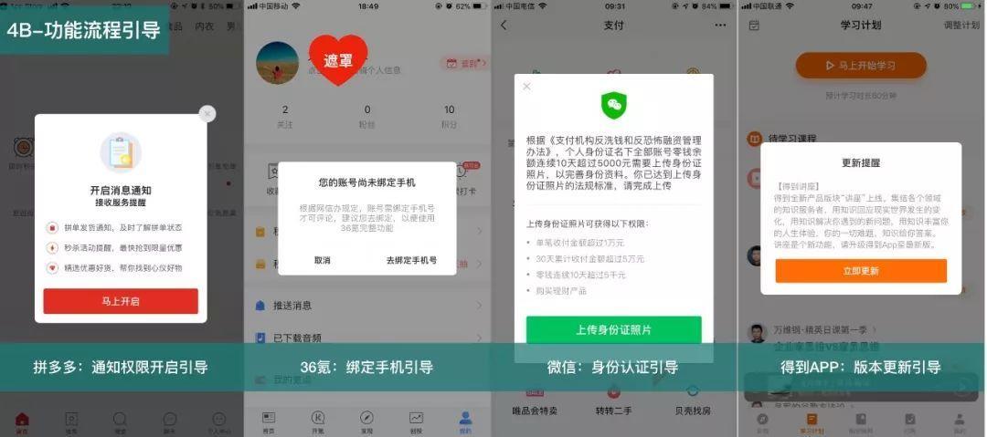 - 功能流程引导:基于后台的业务需要,对于一些分支功能的引导,包括绑定手机号、身份证上传、权限使用、信息更新、版本更新、产品评价等。