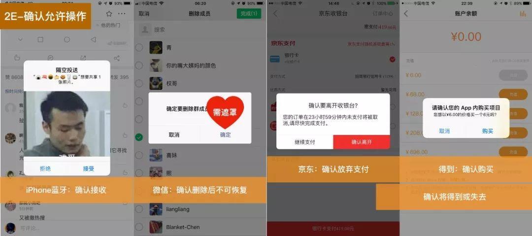 - 确认允许操作:防止用户的误操作。如允许蓝牙共享照片,确认购买,确认删除,确认离开页面等。