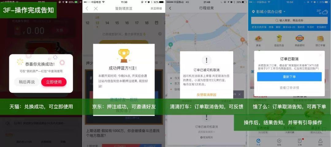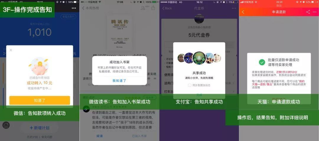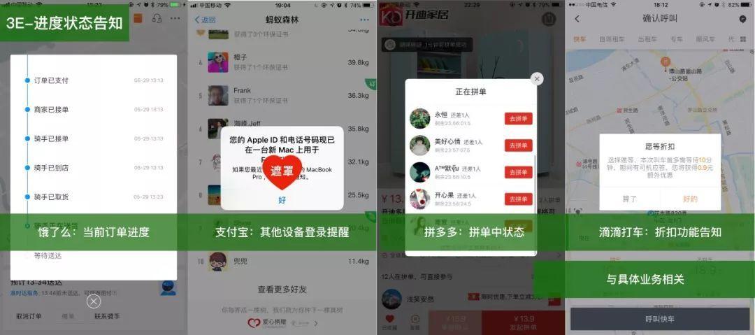 - 进度状态告知:与「具体业务」相关,表示当前业务的进度、产品状态的变化,如外卖订单的状态,电商拼单状态、设备账户状态、打车业务变化状态。