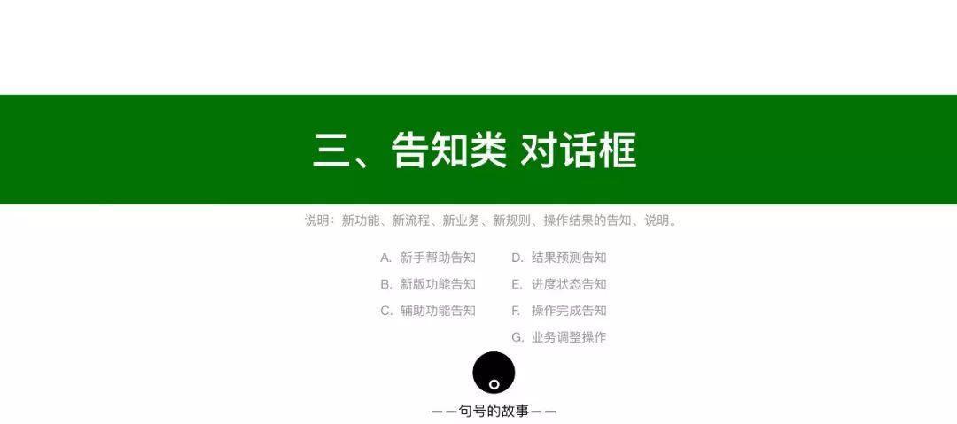 - 操作完成告知:与「具体业务」相关,表示操作完成后的成功或失败告知,分成两小类:(1)只注明事项,没有引导行为;(2)带有引导操作行为的。