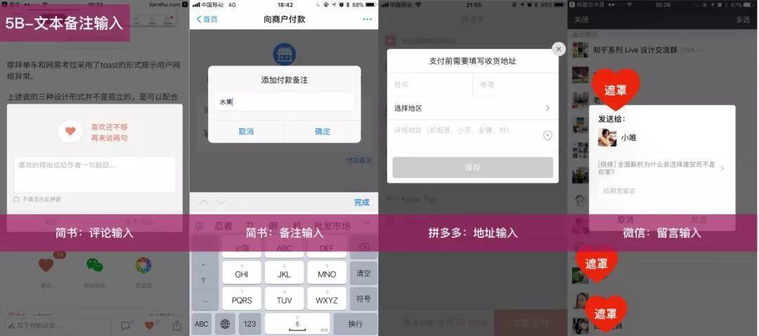 - 文本备注输入:文字的录入。比如评论,付款备注等。