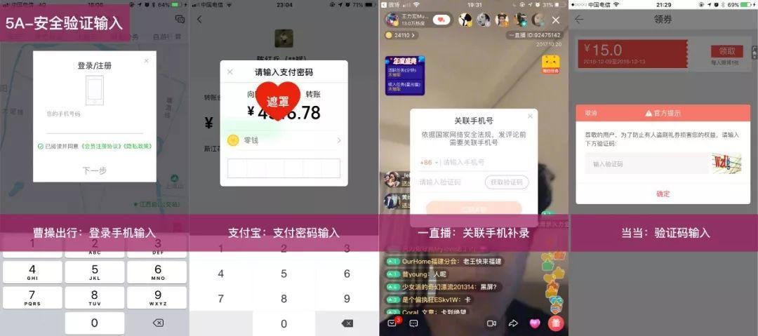 - 安全验证输入:用户身份验证,比如,手机号、验证码、支付密码等。