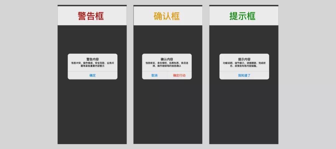 根据它们的代号也可以判断「对话框」的归属:感情强烈的属于警告框;询问语气的属于确认框;不带情感色彩的陈述语气的表示高职类;话说了一半,有进一步行动的就是引导框;需要调用键盘的就是输入框;而全屏在父级视图上堆叠的,就剩下全屏框了。