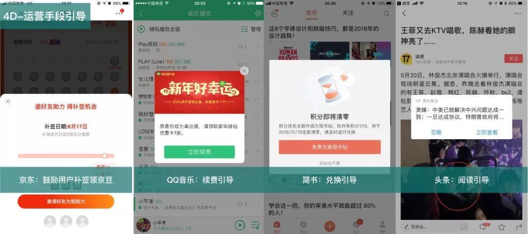 - 运营手段引导:基于运营活动的需要,提供附加的增值功能引导,比如,引导开通指纹,引导续费,引导兑换、引导评价、引导阅读等。