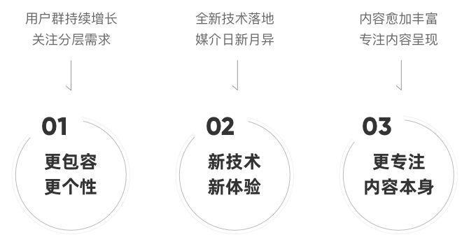 图文内容已经不再是王道,随着短视频的崛起、AR、VR 的发展以及更多样的数字产品发布,内容种类会更多样,而我们需要把这些丰富的内容更直观易用地呈现给用户。