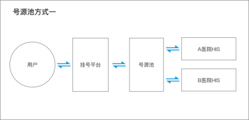 号源池方式一:根据之前方案采用的是号源池与各个医院HIS做数据接口对接,当用户在挂号平台挂号时,平台向号源池请求数据,号源池向医院请求号源,完成挂号。