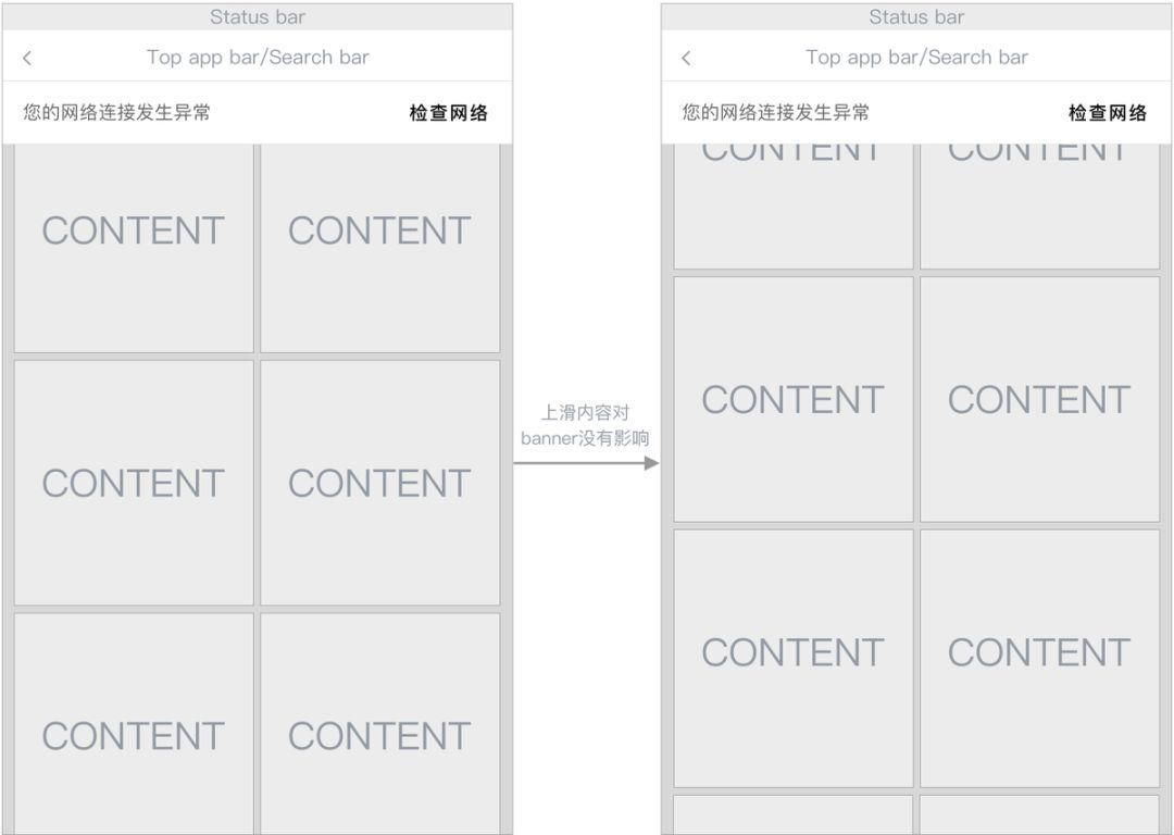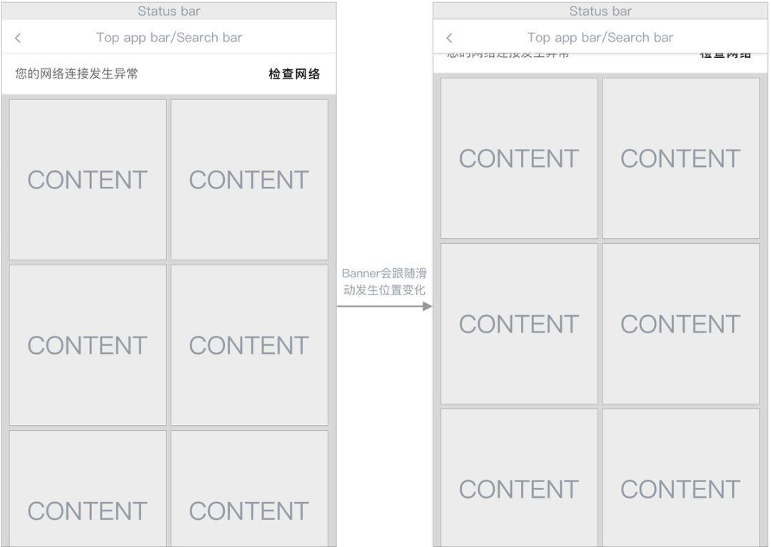 可设置Banner与页面内容同一层级,Banner从顶部向下滑出显示时会将内容向下推移,当页面内容向上滑动时,Banner也会跟随滑出屏幕(不会消失)。