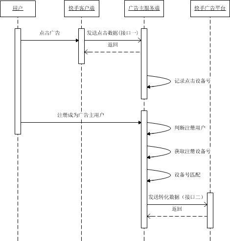 作为广告主, 、 *对接快手API的流程分为 记录点击用户的设备号相关信息 、 新增注册用户判断 、 获取注册用户的设备号相关信息 、 设备号匹配 、 发送注册用户的设备号相关信息 5个环节。