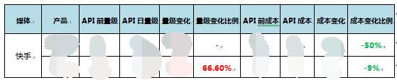 如下表所示,通过本次对接转化数据回传API,实现 、 *在快手信息流投放的量级增长、成本降低。