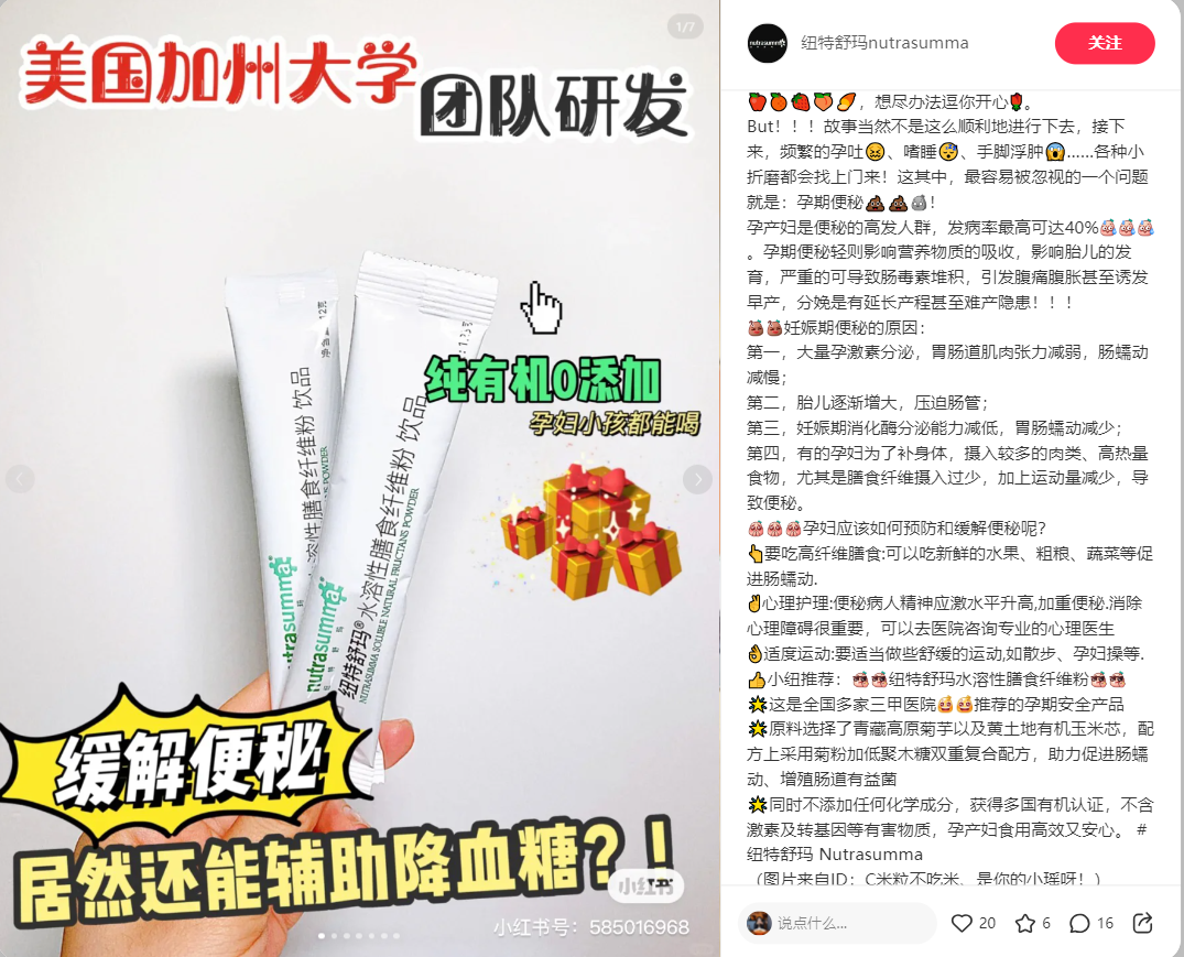通过企业号中的专业性知识输出,能帮助品牌很好的获得权威性的品牌背书。但除了在品牌自己的企业号进行发布,我们还可以跟有专业性代表的kol、koc进行合作,在我们做纽特舒玛的推广时,就通过软植入科普视频的方式将产品“水溶性膳食纤维粉”的产品卖点——改善便秘,展示给用户并打造出爆文。