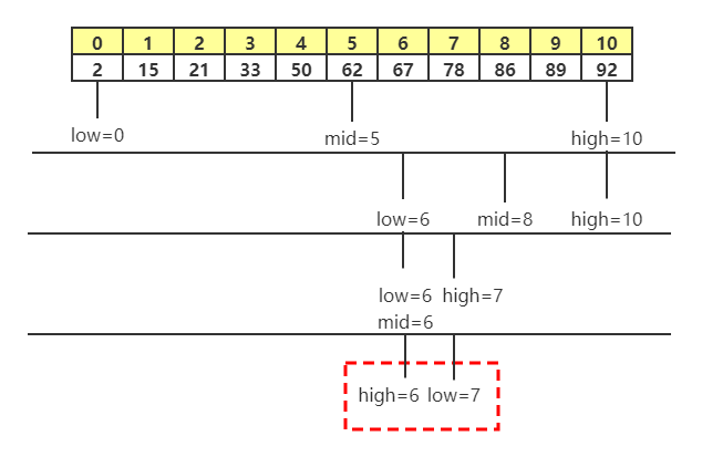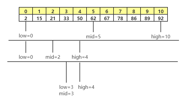 public class BinarySearchTest {public static void main(String[] args) {//给定数组int[] array = new int[]{0,1,2,3,4,5,6,7,8,9,10};//二分查找System.out.println(binarySearch(9,array));//二分查找递归实现System.out.println(binarySearchRecursive(10,array));}/*** 二分查找 不使用递归* 时间复杂度:T(n)=O(log2n)* 空间复杂度:S(n) = O(1)* @param key 要查找的值* @param array 在数组array中查找* @return 若找到,返回key的索引,否则返回-1*/public static int binarySearch(int key,int[] array){if(array!=null){//指定low和highint low = 0;int high = array.length-1;while(high>=low){int mid = (low+high)/2;if(array[mid]==key){return mid;}else if(array[mid]<key){low = mid+1;}else if(array[mid]>key){high = mid-1;}}}return -1;}/*** 二分查找递归操作* 时间复杂度:T(n)=O(log2n)* 空间复杂度:S(n) = O(log2n)*/public static int binarySearchRecursive(int key,int[] array){//指定low和highint low = 0;int high = array.length-1;return binarySearchRecursiveTools(key,array,low,high);}public static int binarySearchRecursiveTools(int key,int[] array,int low,int high){if(low>high){//递归结束条件return -1;}int mid = (low+high)/2;if(array[mid]==key){//数据找到了,递归结束return mid;}else if(array[mid]>=key){return binarySearchRecursiveTools(key,array,low,mid-1);}else if(array[mid]<key){return binarySearchRecursiveTools(key,array,mid+1,high);}return -1;}
