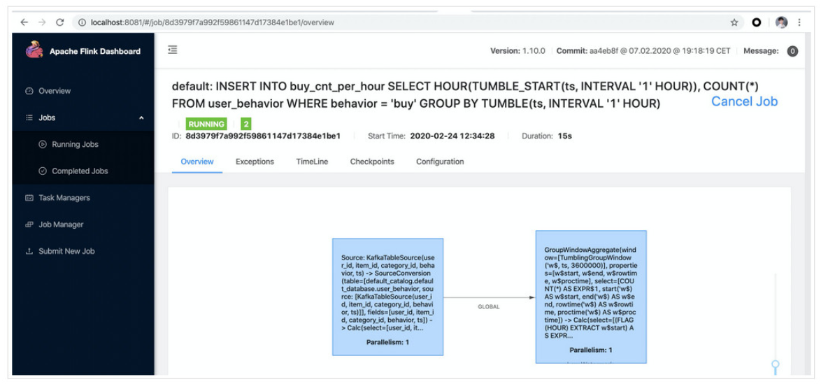 在 Flink SQL CLI 中运行上述查询后,在 Flink Web UI 中就能看到提交的任务,该任务是一个流式任务,因此会一直运行。