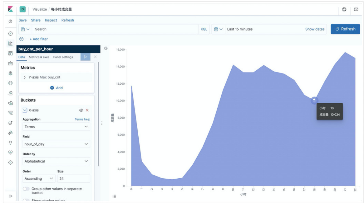 接下来,我们先创建一个 Dashboard 用来展示各个可视化的视图。点击页面左侧的”Dashboard”,创建一个名为 ”用户行为日志分析“ 的Dashboard。然后点击 “Create New” 创建一个新的视图,选择 “Area” 面积图,选择 “buy_cnt_per_hour” 索引,按照如下截图中的配置(左侧)画出成交量面积图,并保存为”每小时成交量“。