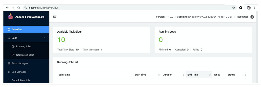 运行成功的话,可以在 http://localhost:8081 访问到 Flink Web UI。并且可以看到可用 Slots 数为 10 个。