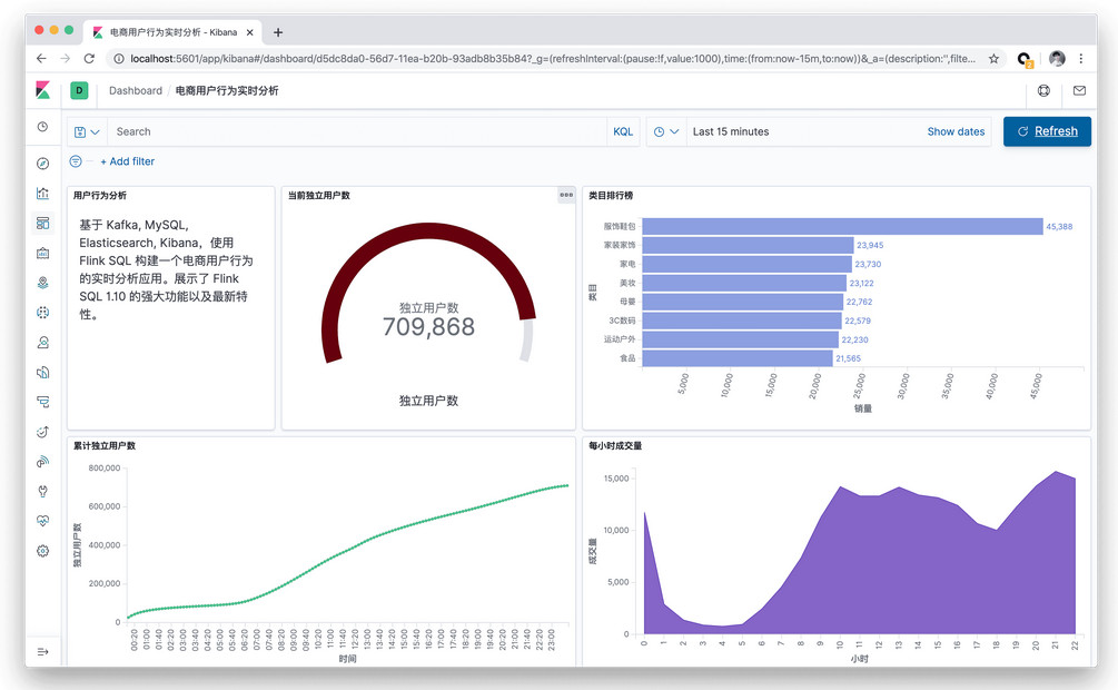 本文将基于 Kafka, MySQL, Elasticsearch, Kibana,使用 Flink SQL 构建一个电商用户行为的实时分析应用。本文所有的实战演练都将在 Flink SQL CLI 上执行,全程只涉及 SQL 纯文本,无需一行 Java/Scala 代码,无需安装 IDE。本实战演练的最终效果图: