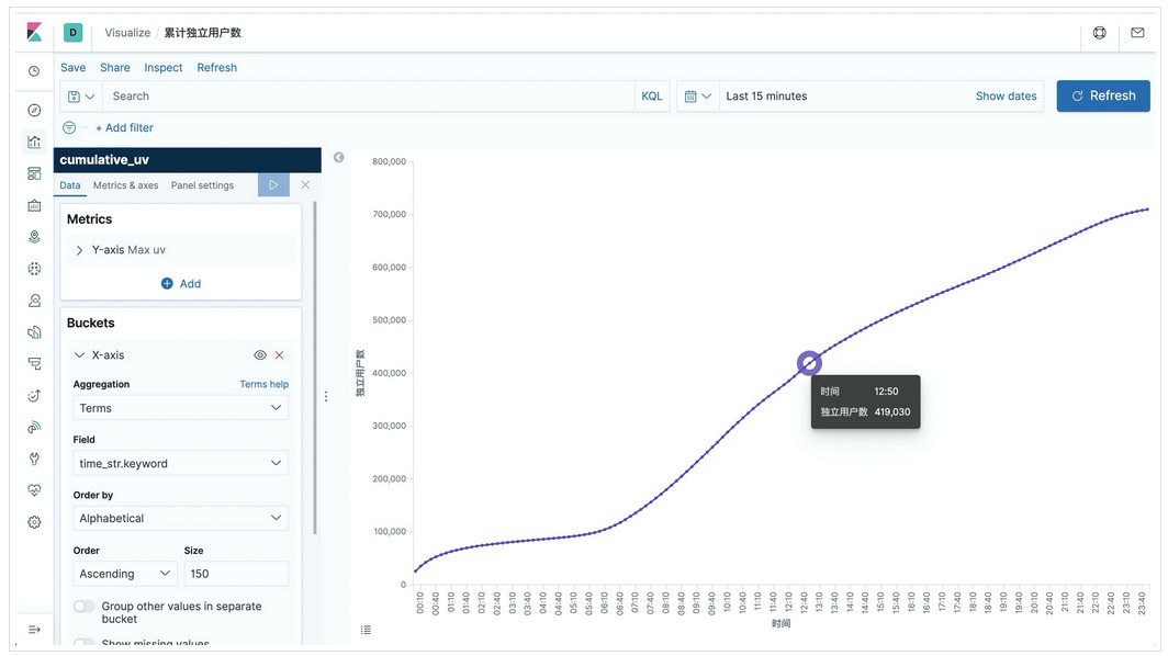 提交上述查询后,在 Kibana 中创建 cumulative_uv 的 index pattern,然后在 Dashboard 中创建一个”Line”折线图,选择 cumulative_uv 索引,按照如下截图中的配置(左侧)画出累计独立用户数曲线,并保存。