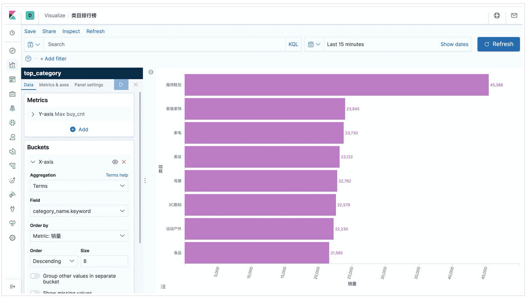 提交上述查询后,在 Kibana 中创建 top_category 的 index pattern,然后在 Dashboard 中创建一个”Horizontal Bar”条形图,选择 top_category 索引,按照如下截图中的配置(左侧)画出类目排行榜,并保存。