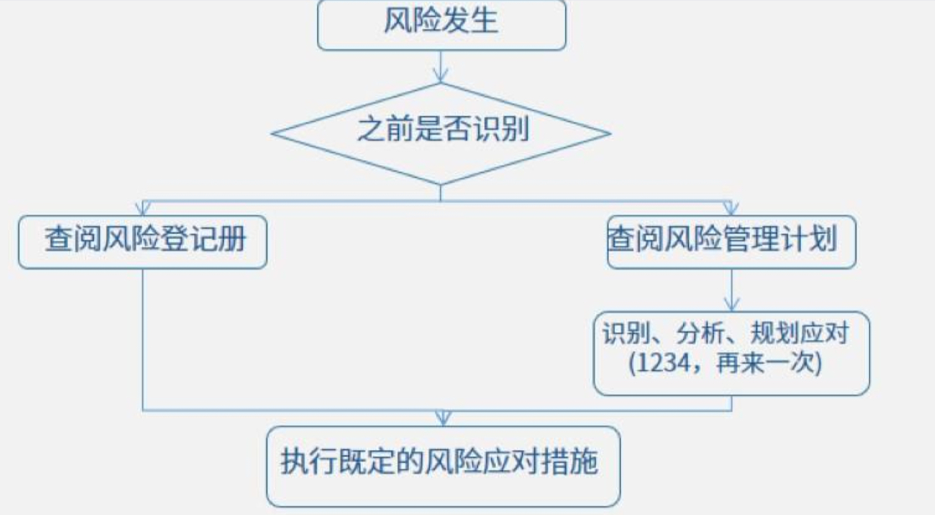 - 次生风险(二次风险)——应对一个风险而导致的风险。如果不应对前一个风险,后一个风险(次生风险)就不会发生。对于次生风险,项目团队应当识别并规划应对措施。新的坑。