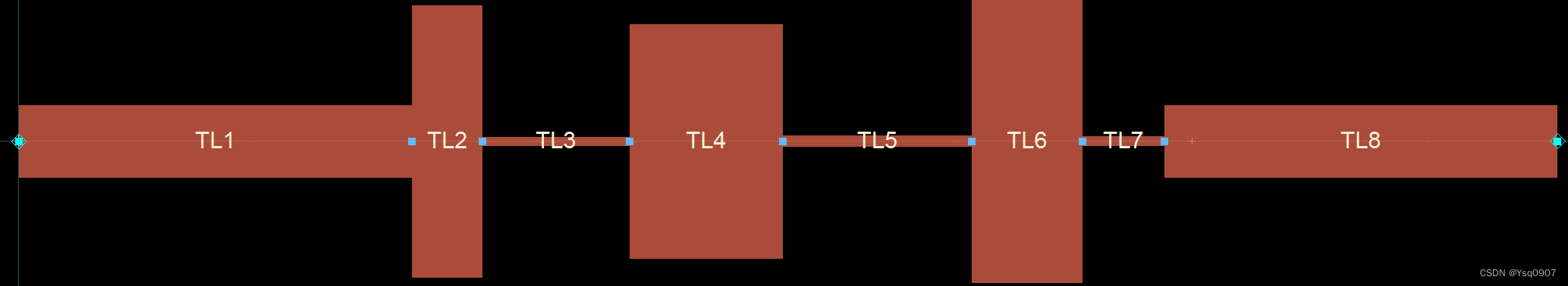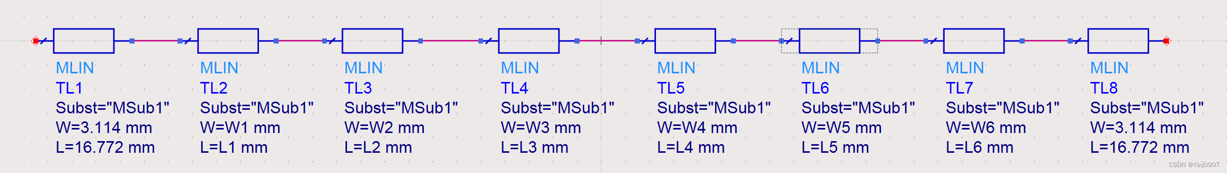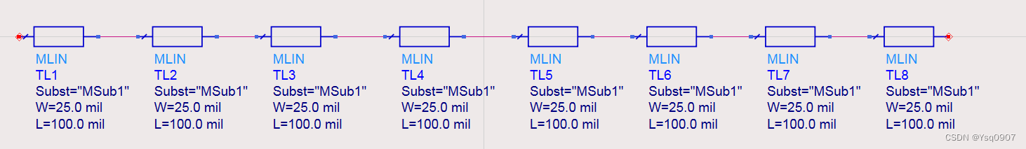 1.新建空白原理图,在设计窗口选择【Tline-Microstrip】元器件面板,添加八个微带线MLine到原理图中,连接起来;