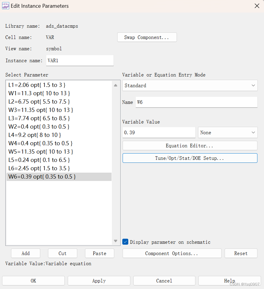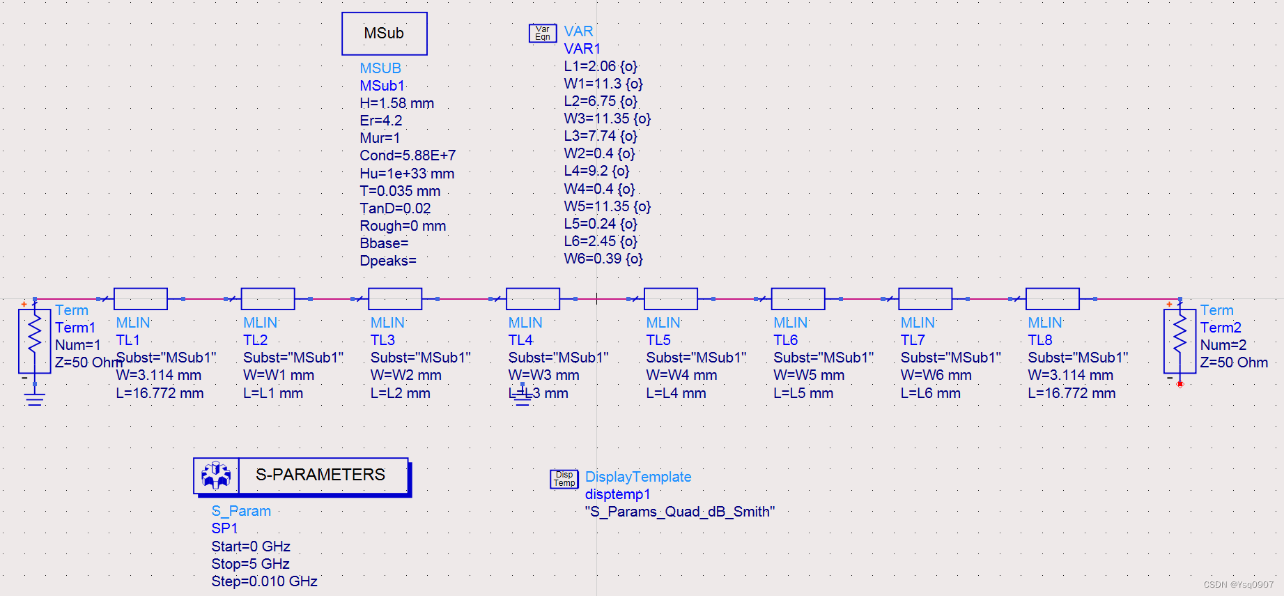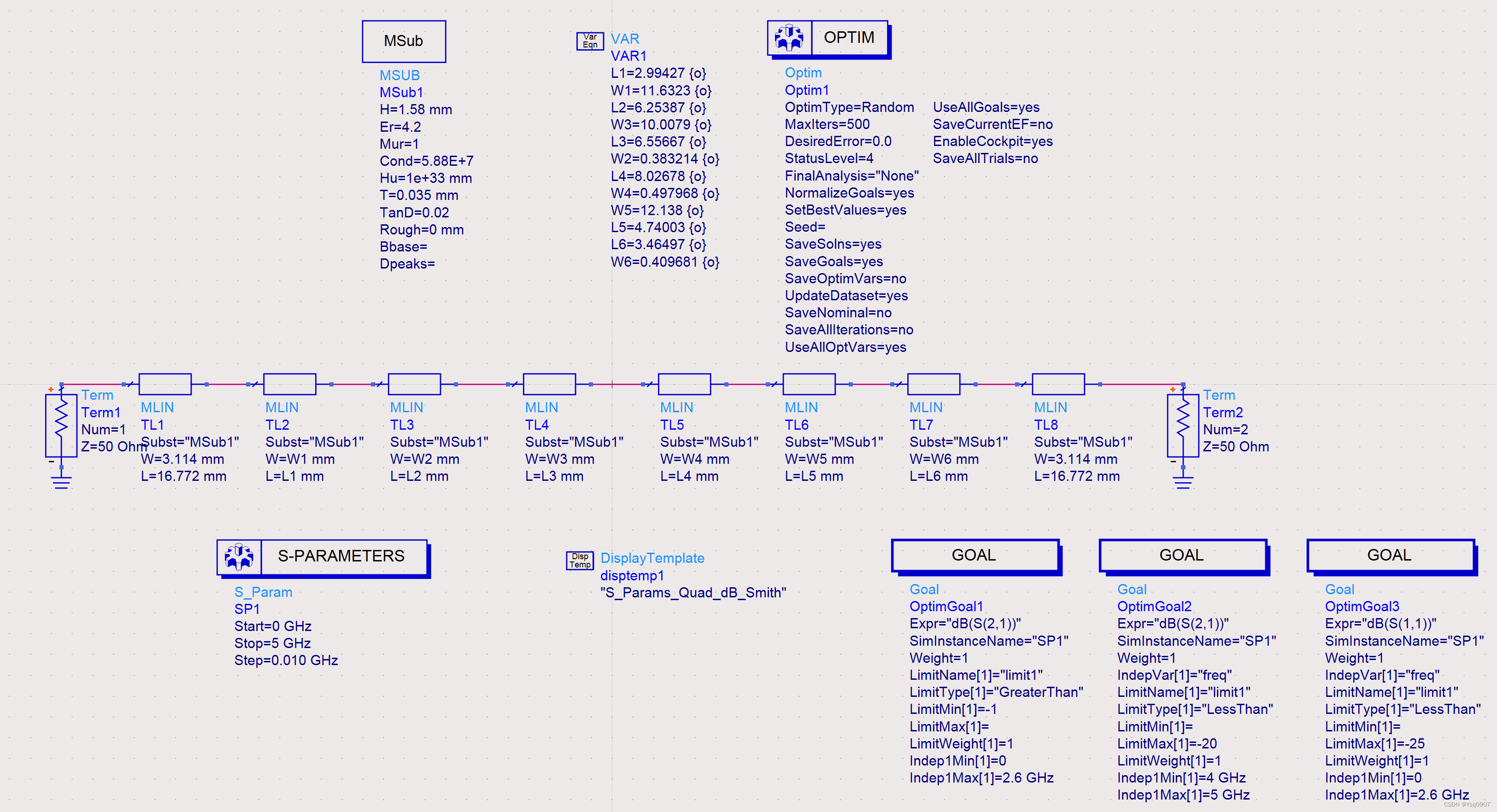 5.用变量代替微带线的长L和宽W,方便后续进行滤波器参数的优化;