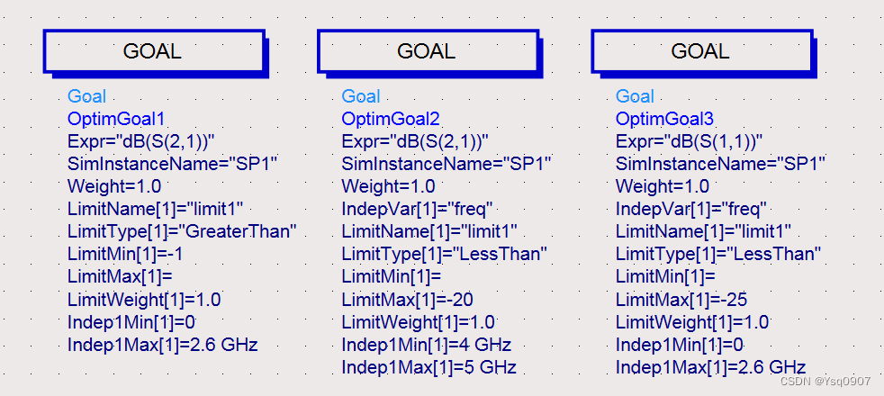 11.添加【Goal】到原理图中,双击设置参数,如图所示,Goal1和Goal2用来设定滤波器的通带和阻带的频率范围及衰减情况,Goal3设定通带内的反射系数(要求小于-25dB);