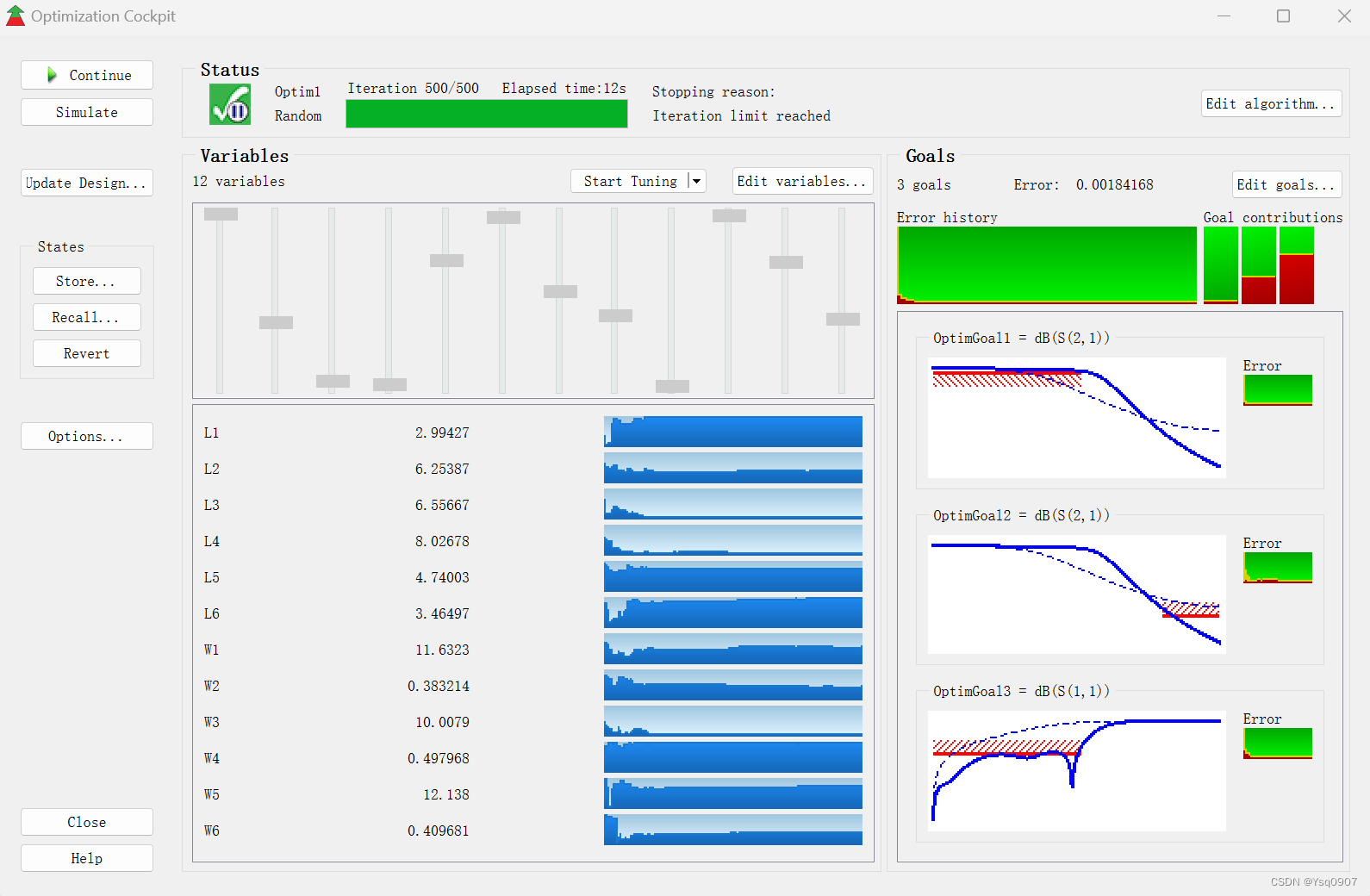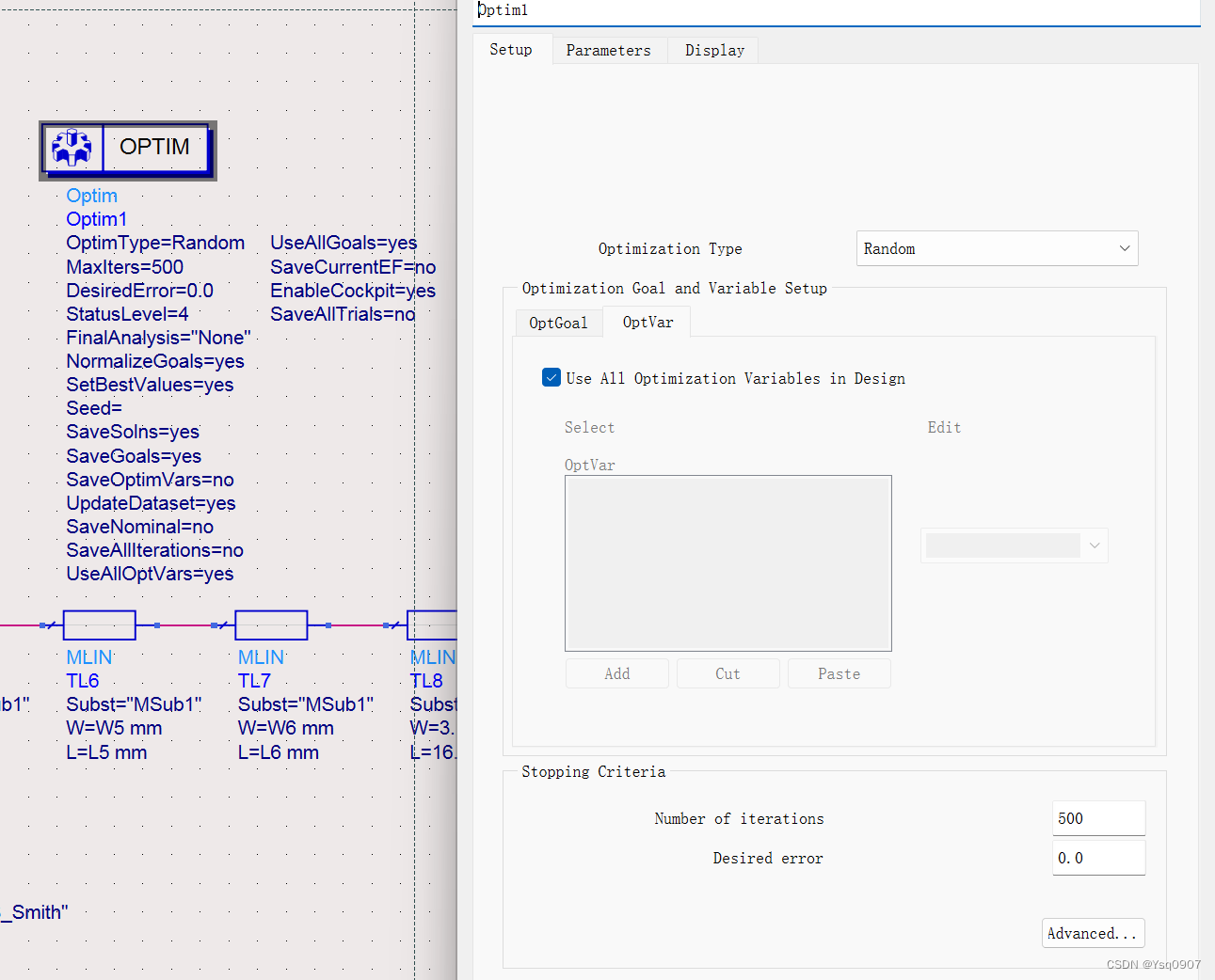 10.(优化)原理图设计窗口选择【Optim/Stat/DOE】→【optim】添加到原理图中,双击进行优化方法和优化次数的设置,将【】设置为500;