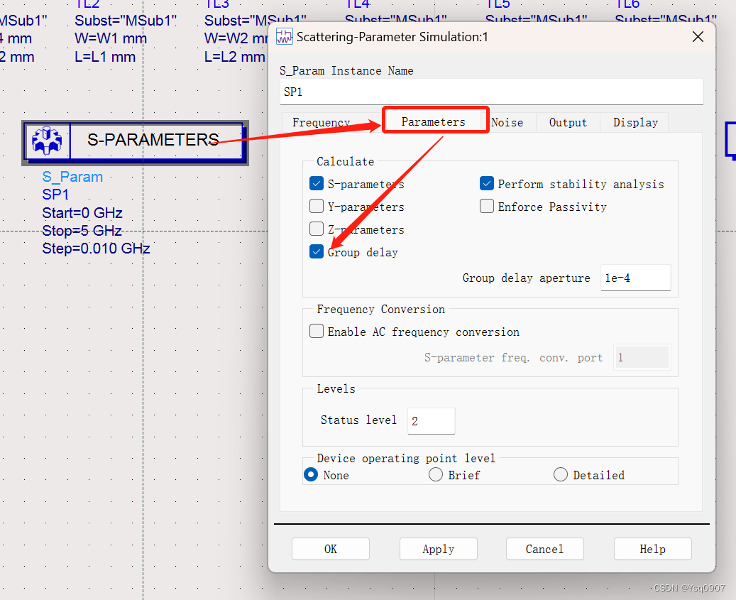 8. 添加S参数仿真元器件,加入原理图中,设置参数;