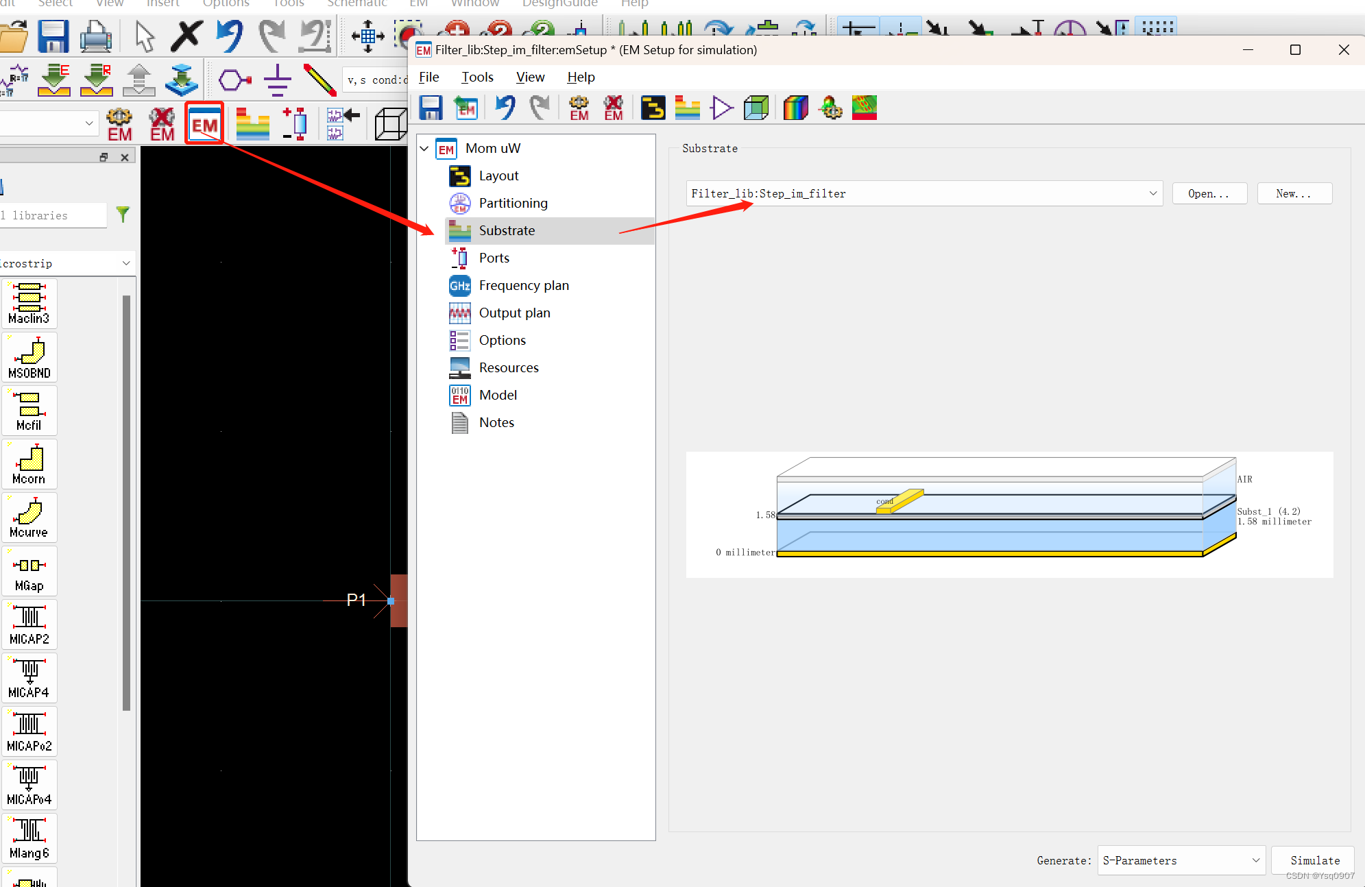 20.点击【EM】→【Substrate】,选择上面的版图;