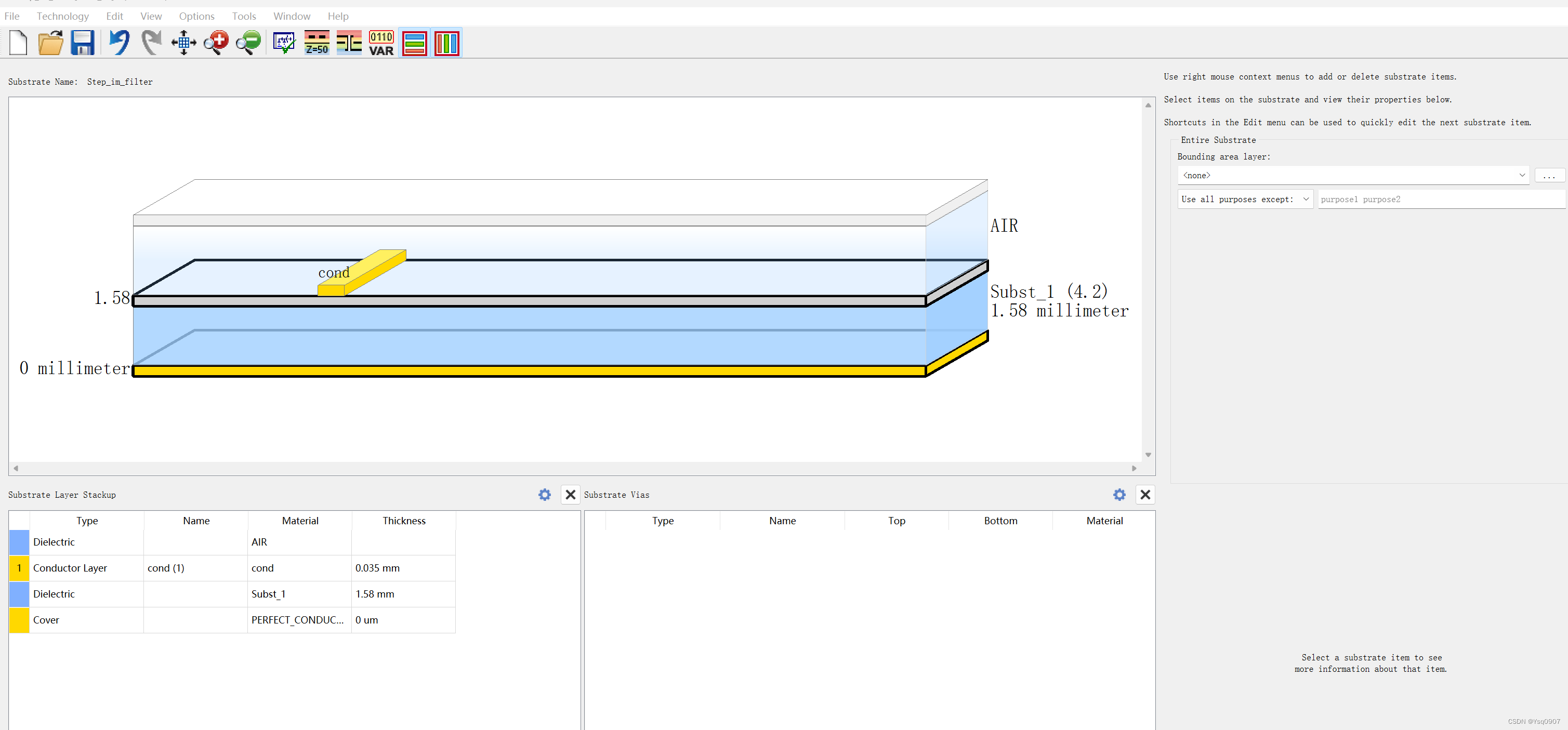 18.设置微带和基板的参数,点击菜单栏【EM】→【Substrate】,单击【OK】,弹出设置窗口,选择 【File】→【Import】→【Substrate From Schematic...】选择上面的原理图,去掉不要的导体;