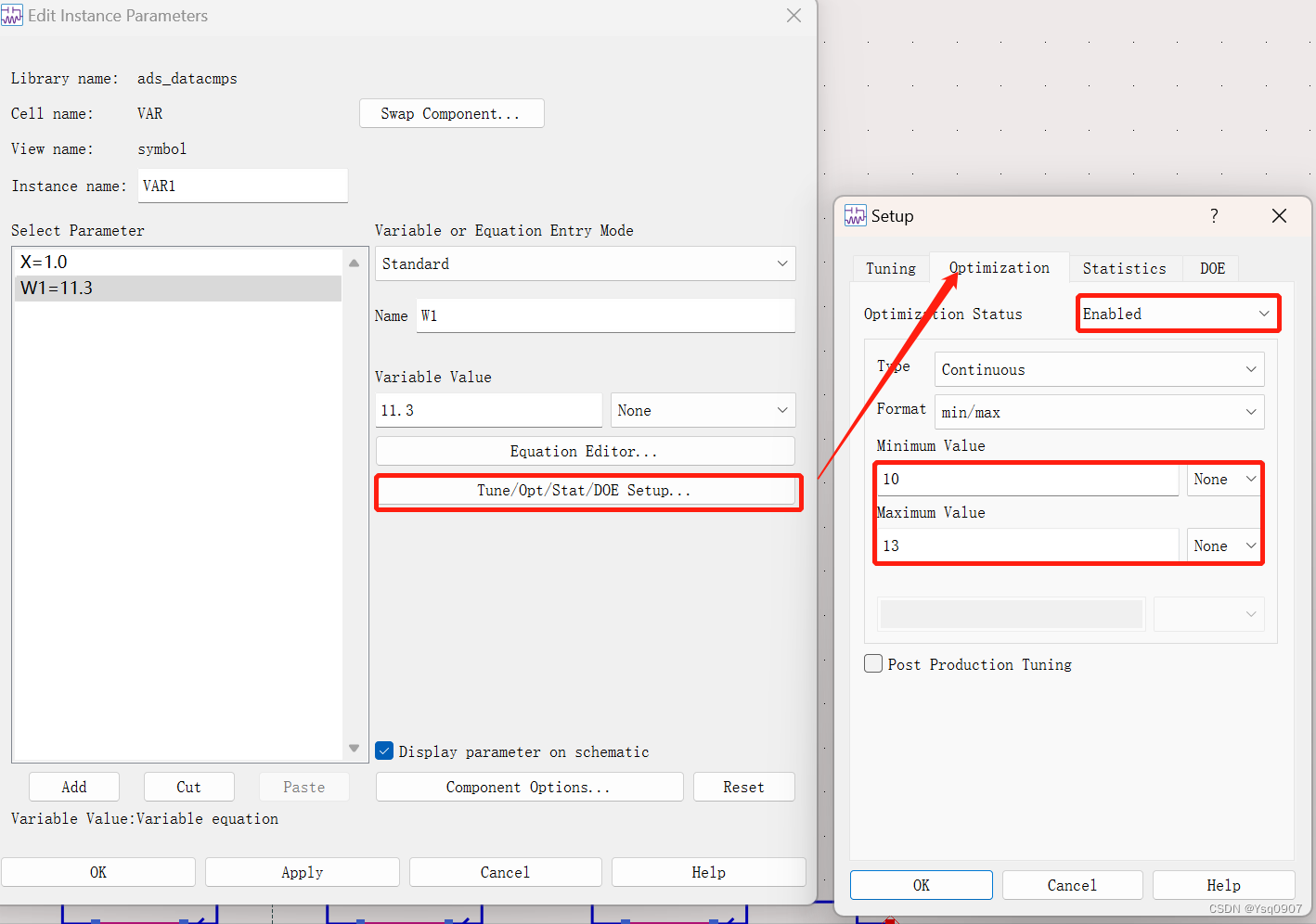6.添加变量控件【VAR】, 设置变量名称和初始值,单击【Add】添加变量,接着点击【Tune/Opt/Stat/DOE Setup】打开参数优化窗口设置变量取值范围;