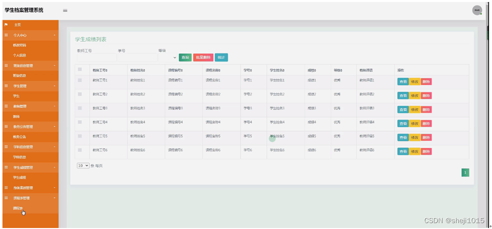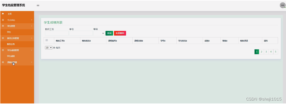学生成绩管理,在学生成绩列表中可以查看教师工号、教师姓名、课程编号、课程名称、学号、学生姓名、成绩、等级、教师评语等信息,并可根据需要进行修改或删除等操作,如图5-8所示。