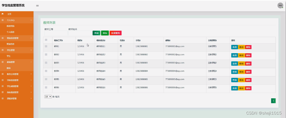 教师管理,在教师列表中可以查看教师工号、密码、教师姓名、性别、手机、邮箱、主教课程等信息,并可根据需要进行修改或删除等操作,如图5-5所示。