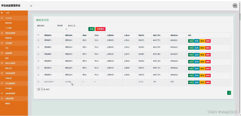 课程表管理,在课程表列表中可以查看课程编号、课程名称、课时、学分、上课时间、上课点、班级号、教师工号、教师姓名等信息,并可根据需要进行成绩、查看、修改或删除等操作,如图5-10所示。